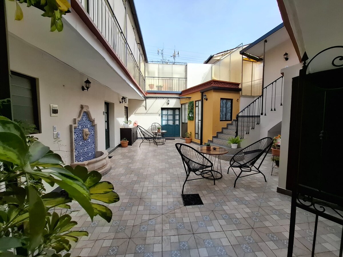 Disfruta de la sencillez de este apartamento tranquilo y céntrico, ubicado en una calle principal del Centro Histórico por donde pasa transporte público, se encuentra a 3 cuadras del mercado central y a 5 de la plaza principal, a pocos pasos de servicio de lavandería, comercios y restaurantes. La casa cuenta con una entrada segura y un patio común del que puedes disfrutar. No se permiten fiestas, ni reuniones ruidosas. Se les proporciona toallas , shampoo y jabón.