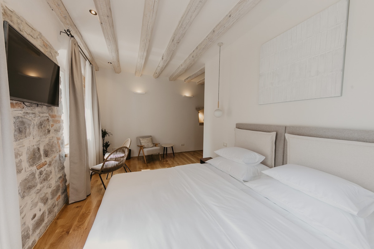 Bright, airy, Mediterranean style. This large room (27sqm/290 s.ft.) shines with a 19th-century exposed stone wall and exposed solid-wood beams. Natural materials merge with a smoothing color palette and a collection of rustic and modern furniture. Wide windows with a city view overlook a pedestrian street in Split’s Old Town. You are in the heart of Split, right next to Riva waterfront promenade and surrounded by all main attractions, restaurants and café-bars. Part of Porto Nativo Split.