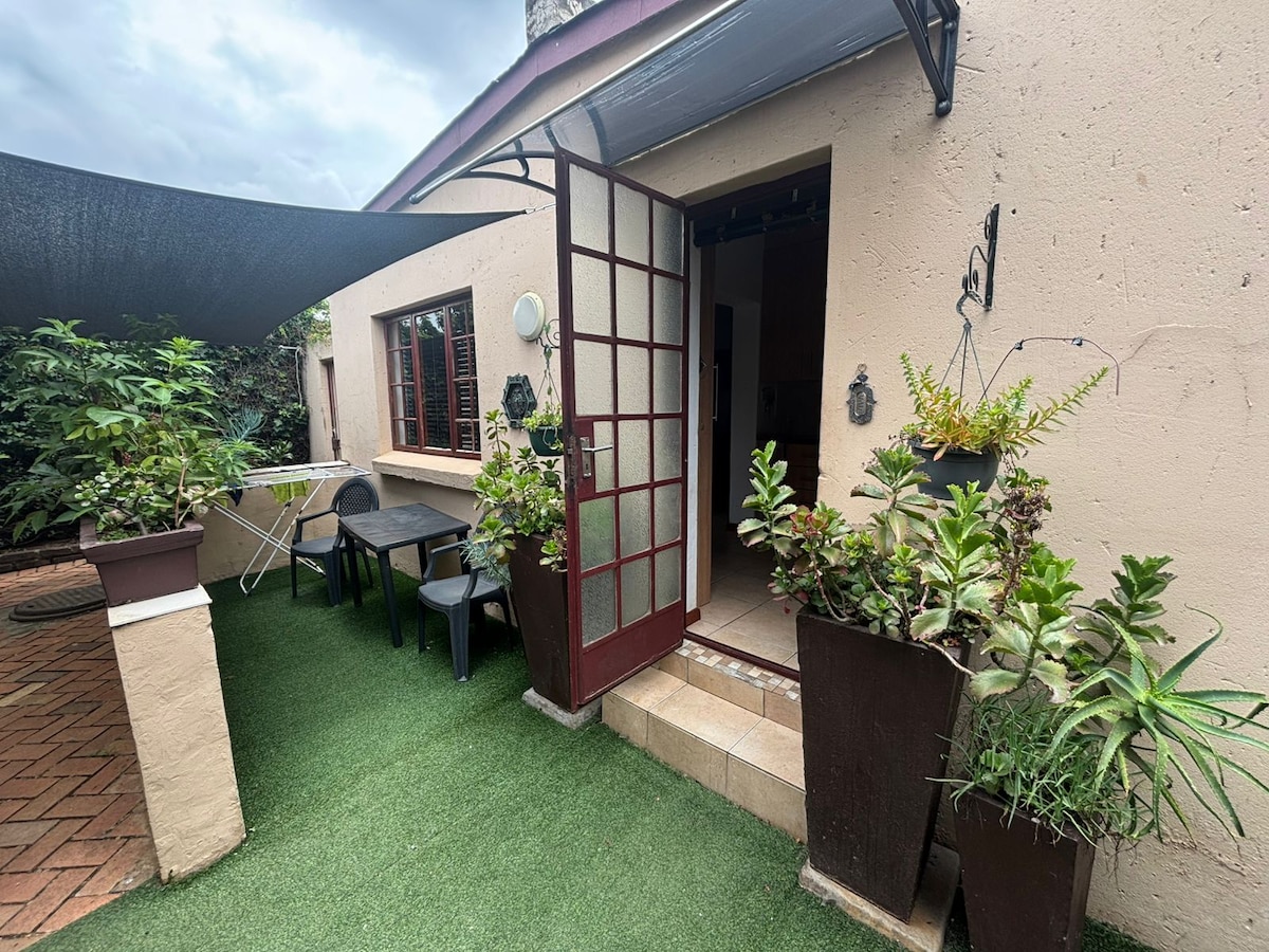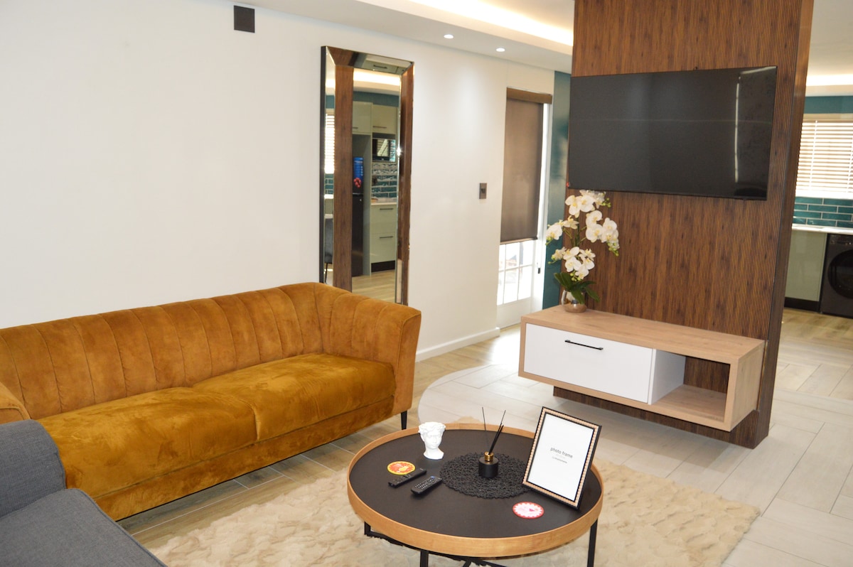 ¡Sin desprendimientos de carga ni interrupciones de agua! Disfruta de una estancia serena en nuestro hermoso apartamento de 1 dormitorio, a solo 9 km de OR Tambo. El dormitorio cuenta con una cama tamaño king, un televisor inteligente con servicios de streaming y un amplio espacio de almacenamiento. La cocina totalmente equipada incluye electrodomésticos modernos y té/café de cortesía. Relájate en el salón con una cama de 3/4. Mantente cómodo con una manta eléctrica en invierno. Nuestros perros Cody y Chloe viven en las instalaciones. La energía solar, la batería de respaldo y el sistema de agua garantizan una comodidad ininterrumpida