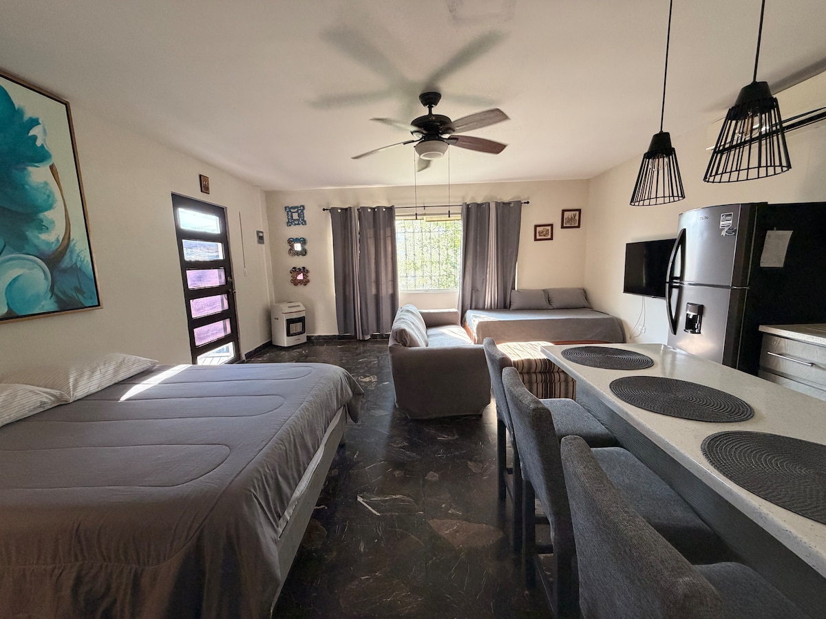 Bonito mini departamento en colonia antigua y popular a tan solo 15 minutos del aeropuerto con fácil acceso a los principales centros comerciales de la zona. Estarás situado a solo 20 minutos del centro de Monterrey. Contamos con cochera particular para un vehículo XL y estacionamiento en el exterior. Departamento climatizado, baño completo con agua fría y caliente. Smart TV con 55” y canales premium. Todo lo necesario para pasar un día cómodo, discreto y tranquilo. ¡Siéntete en casa!