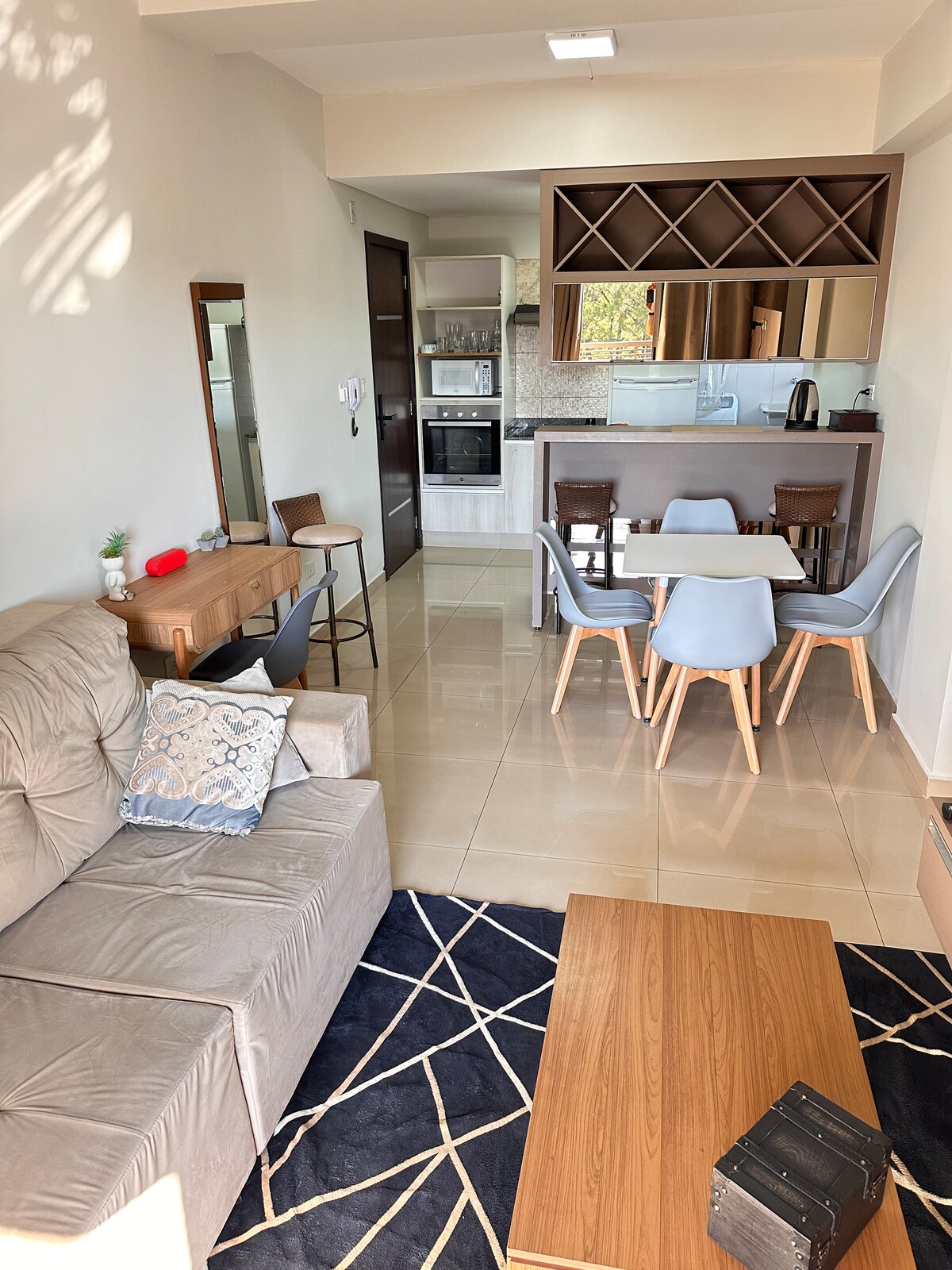 ¡Bienvenido a nuestro apartamento en el centro de Foz! Ubicado en uno de los pocos edificios con lavandería, gimnasio, estacionamiento gratuito y cubierto. El edificio en sí es moderno con seguridad/portería las 24 horas y sala de coworking disponible. Dentro de la unidad, encontrarás comodidad y limpieza. Dos baños, una hermosa vista, 1 cama queen-size y 1 cómodo sofá cama, la cocina está totalmente equipada para que pueda preparar comidas, a solo unos pasos de los mejores restaurantes de la ciudad.