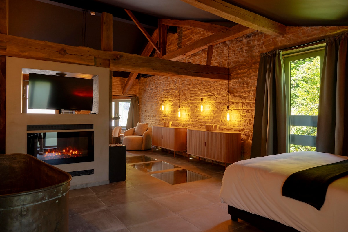 Sumérgete en el universo refinado de nuestra love room con su jacuzzi privado a 38 grados ubicado en su discreto jardín. En el interior, el ambiente es cautivador con su sillón tántrico, la chimenea de bioetanol y la ducha XXL con efecto lluvia. Una cama tamaño king 220*200 con ropa de cama de calidad, y frente a ella una pantalla de televisión gigante. El wifi, el aire acondicionado reversible y los accesorios traviesos harán de su estancia un momento de pura relajación y tentación...