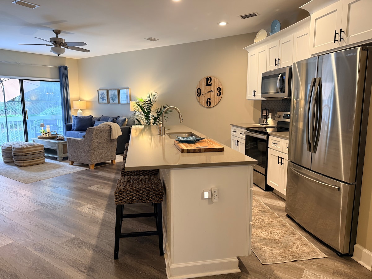 ¡UBICACIÓN, UBICACIÓN! Unidad final luminosa y bonita en el corazón del paseo marítimo. Hermosamente decorado en un estilo costero: dormitorio tamaño king y ducha personalizada con azulejos. A pie de todo, incluido el río May. Porche cubierto al aire libre para disfrutar de las vistas y los sonidos del paseo marítimo y escuchar música en vivo desde tu propia terraza. Nada de fiestas, nada de mascotas.