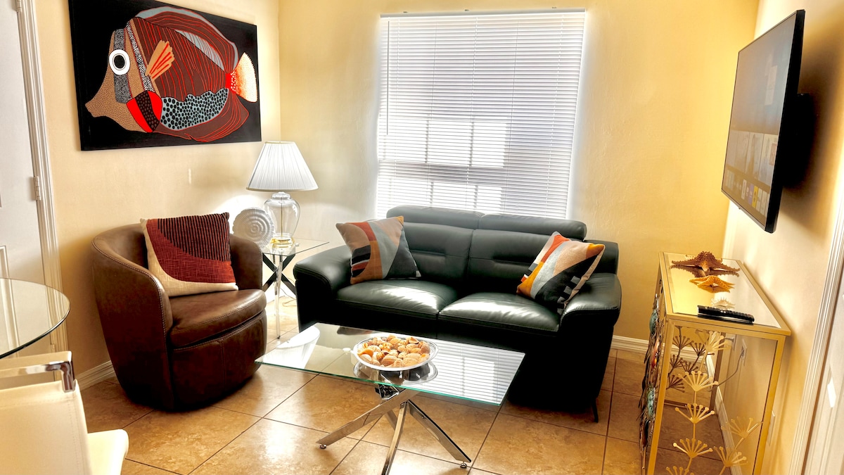 Olvídate de las preocupaciones en este gran alojamiento: ¡es un oasis de tranquilidad! Este es un apartamento tipo estudio completo con entrada privada. Zona de estar al aire libre. Televisor inteligente con Netflix, Disney+. Cama tamaño queen con colchón de lujo. Armario y tocador. Ducha de azulejos a ras de suelo con tocador completo. Incluye artículos de aseo y secador de pelo. Cocina pequeña con nevera y congelador. Keurig con café de cortesía Cocina de inducción Microondas Horno tostador/freidora de aire Lavadora/secadora Toallas de playa, sillas, sombrilla Estacionamiento para 1 auto A poca distancia en coche de la playa, tiendas y restaurantes.