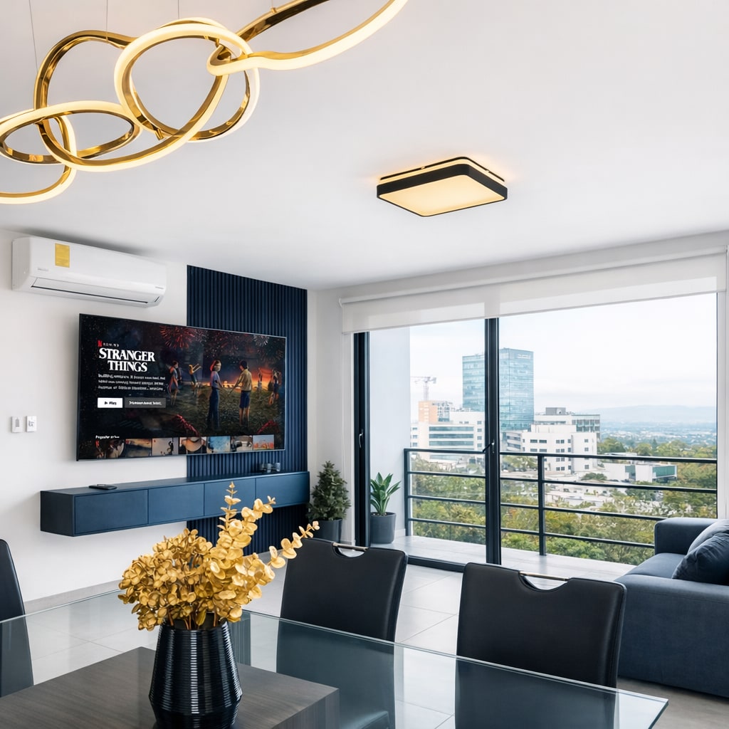 Apartamento con estilo ecléctico moderno en una de las zonas más exclusivas y seguras de San Salvador. Con una vista espectacular donde puedes observar el Volcán de San Salvador y parte de la ciudad. El edificio es nuevo y cada elemento que integran el apartamento están pensados en la comodidad del huésped para que su experiencia sea placentera y acogedora. Cada espacio es sanitizado y limpiado exhaustivamente luego de cada estadía.