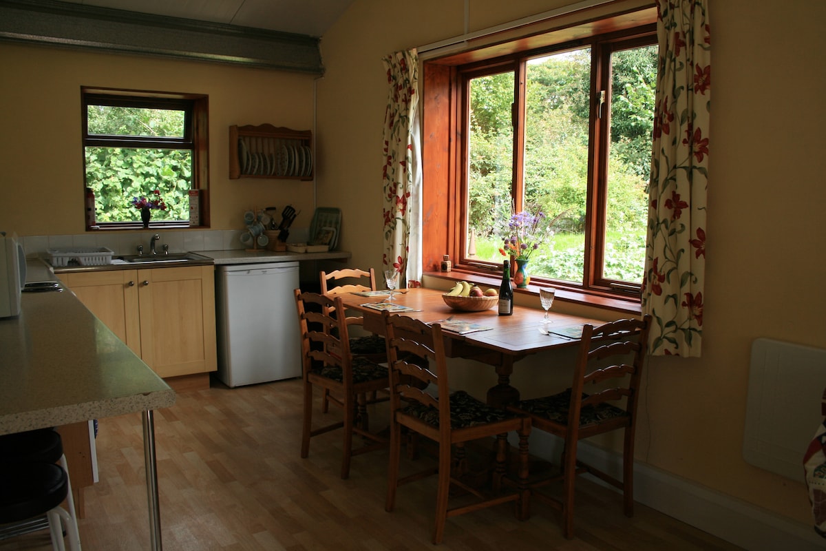 El exclusivo Tin Shed ha sido diseñado con materiales sostenibles y reciclados, con obras de arte originales de artistas locales y lleno de luz natural. Está revestido de madera creando un ambiente cálido y natural y también cuenta con una estufa de leña. Una cocina compacta y bien equipada, sala de estar, baño en la planta baja con ducha de hidromasaje y WC. Arriba hay un dormitorio generoso con camas tamaño Super King o individuales, y hermosas vistas a la campiña ondulante desde una ventana panorámica. En el exterior hay un patio y una chimenea.
