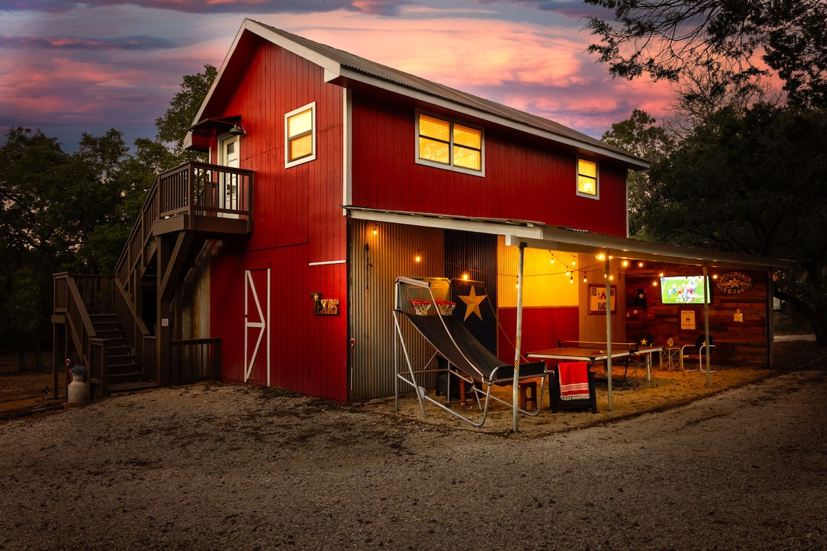 Boutique barn stay 9 peaceful acres • Just 7 min from downtown Boerne • King suite + cozy living area w/ sofa sleeper • Full kitchen for easy meals • Outdoor games & wide open space • Wildlife under beautiful oak trees • Feed the deer with deer corn provided • Texas-themed charm with luxury touches • Brand-new mural wall by renowned artists—perfect photo spot • Relax under starry skies & explore Boerne’s Hill Country magic