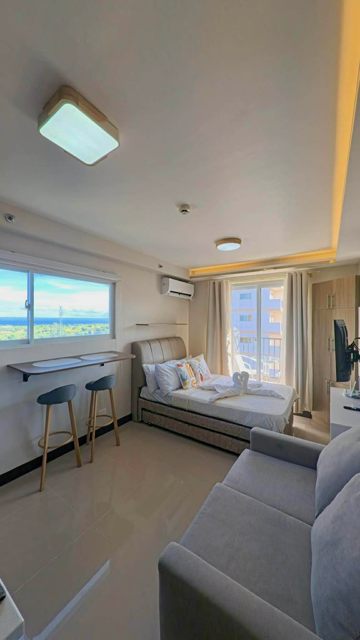 Comfy, accessible, and aesthetic condo studio unit near Mactan Cebu International Airport 24 sqm condo unit with balcony Oceanview with Queen-sized bed • can fit 4-6 pax • extra foam mattress and extra blanket provided • free pool access for 2, paid parking inside Bathroom with: • shower, heater, bidet • shampoo | conditioner | body gel provided • towels Entertainment • 200 mbps internet connection • 1080p 4K Smart Projector with surround sound • Mini karaoke • Card and board games
