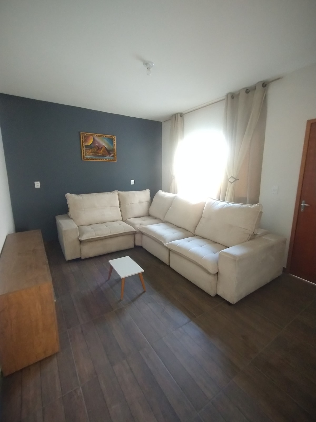 Apartamento mobiliado em Conselheiro Lafaiete-MG, com 2 quartos, sala/cozinha americana, banho social, área de serviço e garagem. Na mobília estão incluídos: 2 camas de casal com colchão, 2 guarda roupas, sofá retractil, 1 painel para TV, 1 smart TV 43", armários de cozinha, 1 mesa com 4 cadeiras, geladeira frost free, fogão 5 bocas, 1 máquina de lavar, 1 máquina de lavar, 1 microondas, 1 liquidificador e 1 bujão de gás