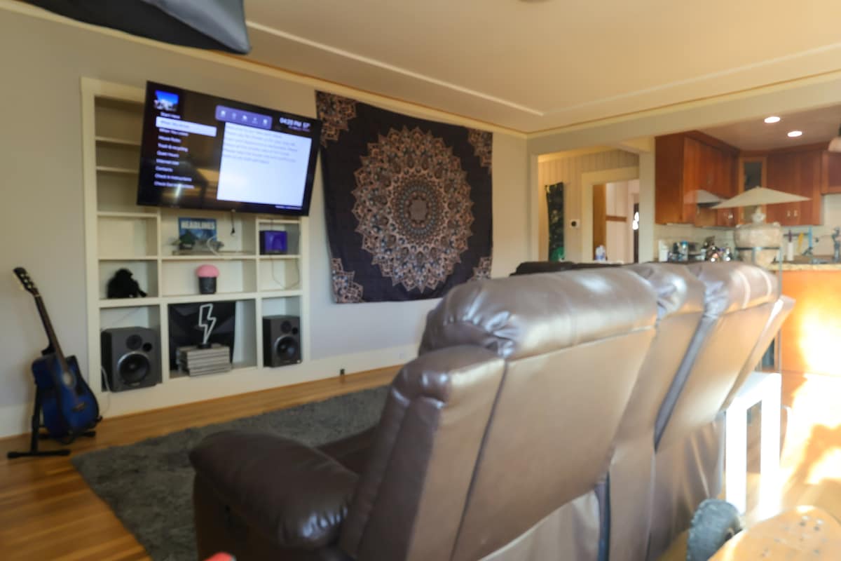 Relax in this stylishly furnished, central, updated, top-floor San Francisco apartment. Located in the Duboce Triangle neighborhood, this home is located in a safe and very central area. The apartment is spacious and surrounded by trees, making it very quiet. There’s a cute backyard and small patio out the backdoor. Inside, you’ll find a comfortable modern space with a huge projection screen and a large open plan living/dining space.