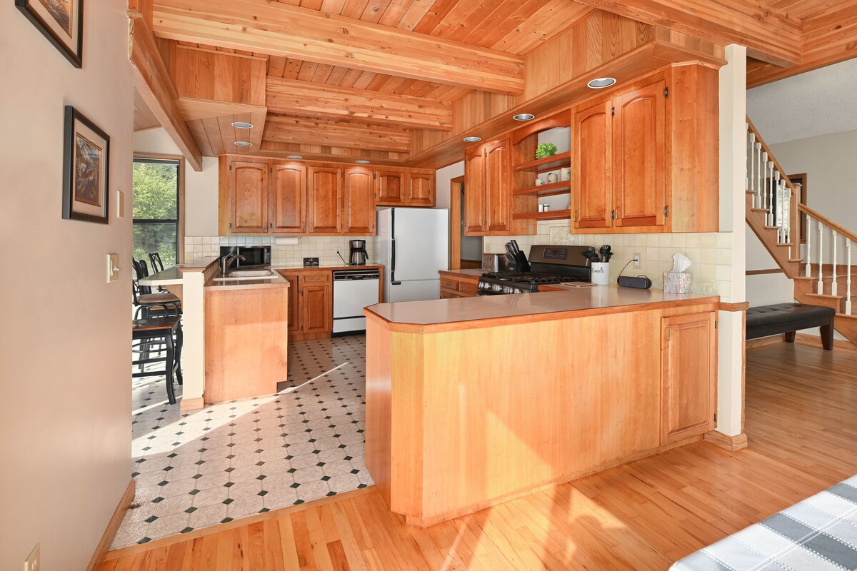 Esta increíble casa de madera cuenta con un lujoso dormitorio principal con una cama tamaño king y un baño privado en el loft. El área de abajo incluye tres camas tamaño queen y un cómodo medio baño con lavadora y secadora. El piso principal cuenta con una cocina totalmente equipada, un baño y una acogedora sala de estar. Los seis taburetes de bar alrededor de la barra de la cocina y la mesa de comedor para seis personas ofrecen un amplio espacio para el entretenimiento de hasta doce huéspedes.