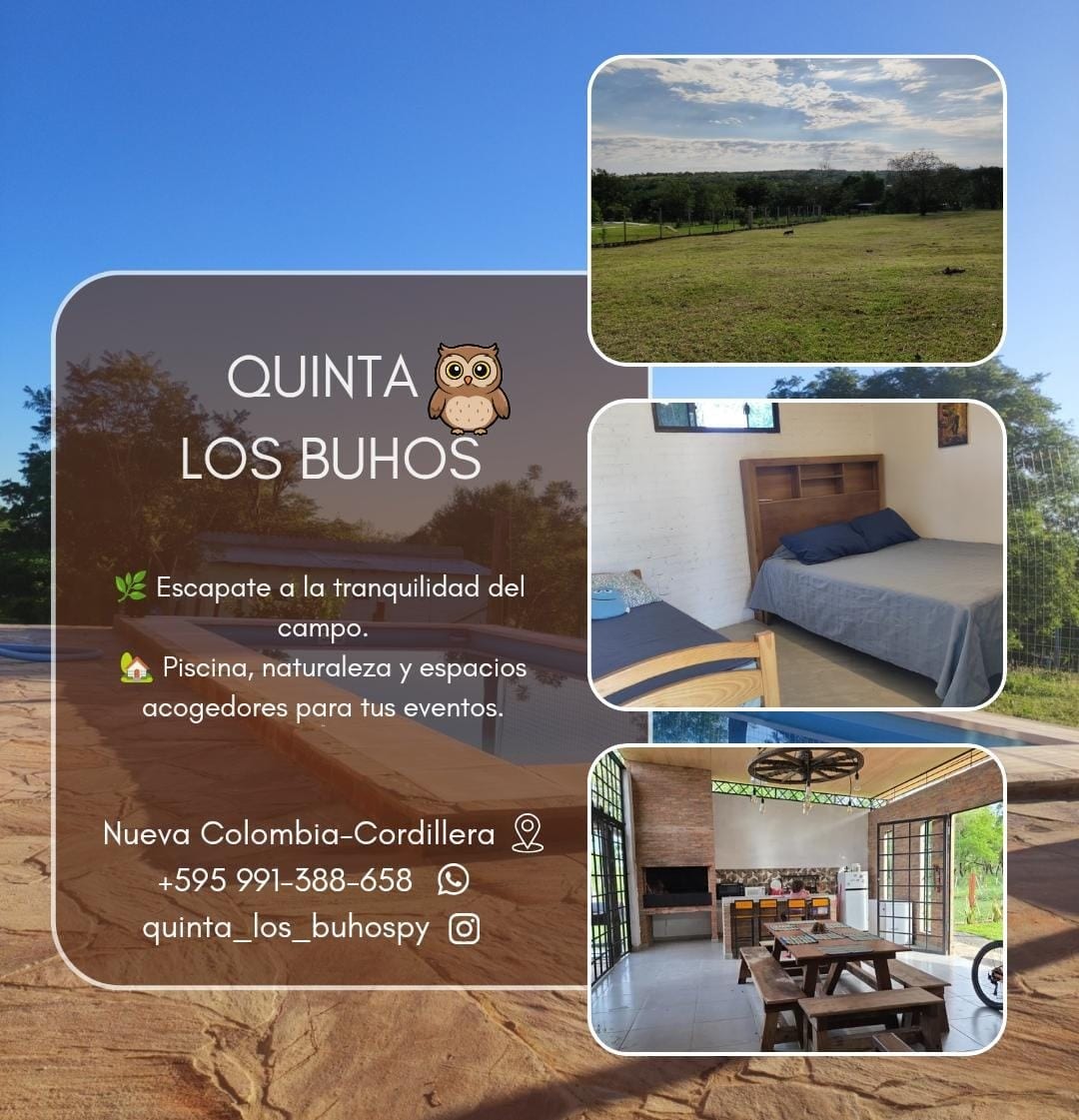 ¡Escápate del ruido y conéctate con la naturaleza! Bungalow en una propiedad de 40.000 metros cuadrados (4 hectáreas), a solo 10 minutos del aeropuerto y 20 minutos del corazón de Asunción. Perfecto para familias y amigos, aquí podrás relajarte junto a la laguna, pasear por la naturaleza, nadar en la piscina, asar en las parrillas o disfrutar de nuestras canchas deportivas. Un rincón único donde crear recuerdos inolvidables, rodeado de paz y aire puro. ¡Te esperamos!