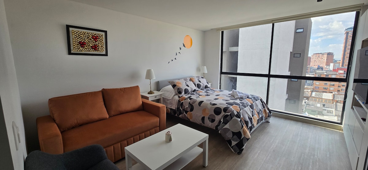 Relájate en este espacio tan tranquilo y elegante. Este Loft se encuentra a solo 5 minutos a pie de la embajada americana, Corferias, Centro de Convenciones Agora y a 10 minutos en coche al Aeropuerto El Dorado.En sus al rededores cuenta con centros comerciales y restaurantes. Es un espacio perfecto para aquellos que van buscan comodidad, tranquilidad y elegancia, permite un alojamiento hasta para 3 personas ya que el apartaestudio cuenta con una cómoda cama doble y un elegante sofacama.
