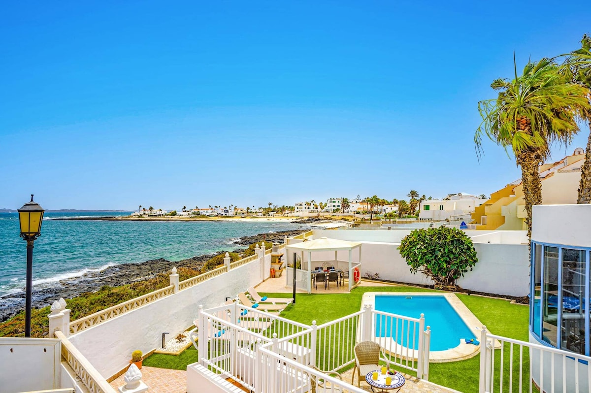 VV A pie de Playa en el centro de Corralejo. Increíbles vistas a Isla de Lobos y Lanzarote. Acceso directo a la playa. Un alojamiento perfecto para disfrutar del buen clima de nuestra isla con la familia y amigos. Amplio salón con vistas al mar, 3 Habitaciones, 2 Baños completos (uno de ellos en suite), cocina equipada, jardín y terrazas. Parking Privado. Wifi y Nexflix gratuito. A 5 minutos de las zonas de tiendas y restaurantes de Corralejo.