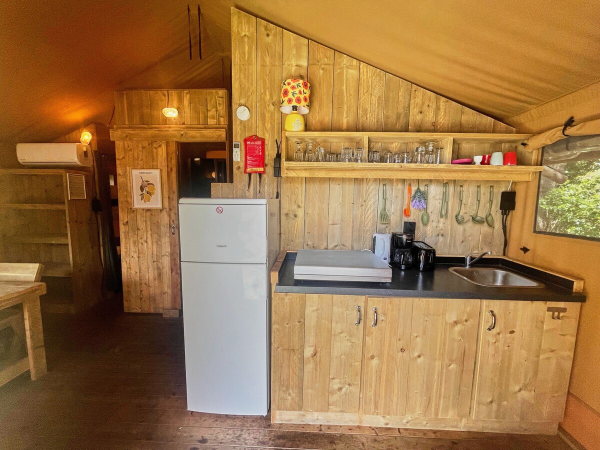 Tiendas glamping situadas en la parte media-alta del resort. Capacidad para 4 personas. Disponen de dos dormitorios, uno con cama de matrimonio (150x200) y otro con litera de camas individuales (80x200); cocina equipada. Terraza cubierta con sofá y mesa de madera para pícnic. No dispone de baño pero sí de agua corriente, deben utilizarse los baños y duchas de la zona común de acampada. Sábanas y toallas no incluidas (ofrecemos servicio de alquiler). No se aceptan mascotas.