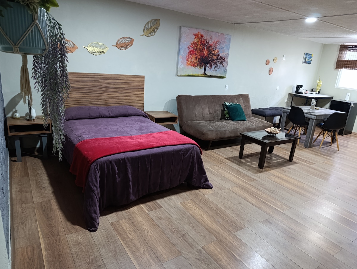 Es un loft donde podrás descansar y relajarte con toda privacidad y todas las amenidades como: Wi Fi 5G, luces leds, agua caliente, agua potable, regadera enorme tipo lluvia, secador pelo, cafetera eléctrica, cama super comoda con sábanas suaves, sofá cama, smarttv, espejo de cuerpo entero, refrigerador, comedor, escritorio de trabajo, estacionamiento con portón eléctrico para que que sea tu estancia todo un éxito.