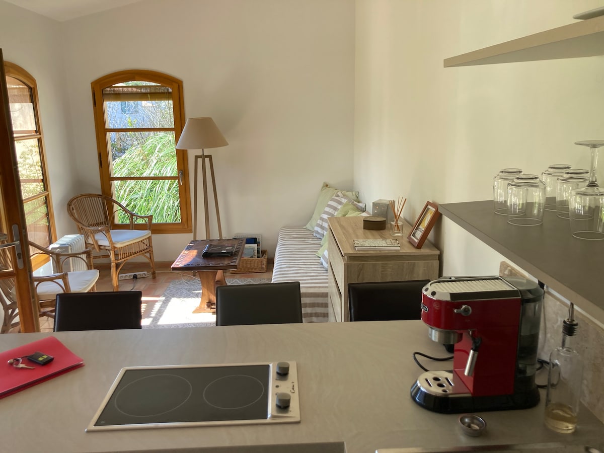 Venez vous détendre dans cet appartement de 31 m2 climatisé attenant à notre villa situé à 800 mètres du centre ville, 1,2km des plages, à proximité de la forêt et à 3 km de Sanary et de son marché nocturne l'été. Quartier calme, parking privatif . Cuisine équipée, plaque vitro, micro onde, four réfrigérateur cafetière, bouilloire, grille pain Belle terrasse avec barbecue gaz chaises longues Draps et serviettes fournis Un bip portail vous sera remis à votre arrivée