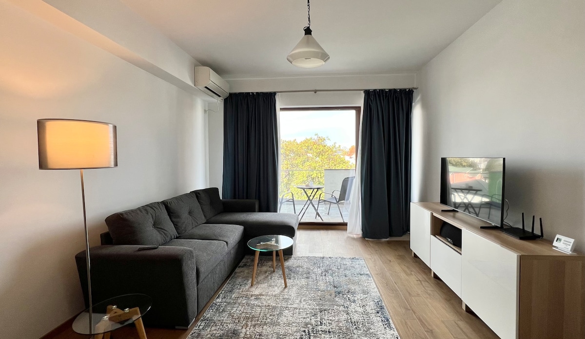 Apartamento moderno y cómodo ubicado en la zona central de Craiova, en una calle tranquila,equipado con otras nuevas que consisten en: un amplio dormitorio equipado con una cama doble, TV, escritorio,inodoro;una sala de estar con TV grande, esquina extensible; un balcón bellamente dispuesto, un baño nuevo equipado con bañera ; cocina totalmente equipada: cocina,nevera, lavadora, cafetera, campana, platos, tazas, cubiertos, utensilios de cocina, etc.;un pasillo con percha y vestidor. Todos los muebles y servicios son nuevos.