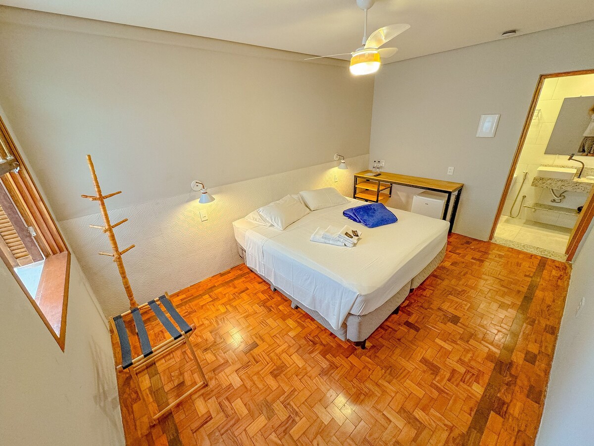 Encantadora suite llena de personalidad, un pueblo italiano único y tradicional. Situado en el centro de Serra Negra frente a la Iglesia Matriz, a 300 metros de la Fontana di Trevi, acceso a pie a la plaza central, principales bares y restaurantes, junto a un estacionamiento 24 horas. Cuenta con baño y ducha privados, equipados con AIRE ACONDICIONADO, Smart TV, minibar, edredón incluido, ropa de cama y toallas. Tenemos un rincón de café comunitario. Nota: ¡no tenemos desayuno ni servicio de habitaciones!