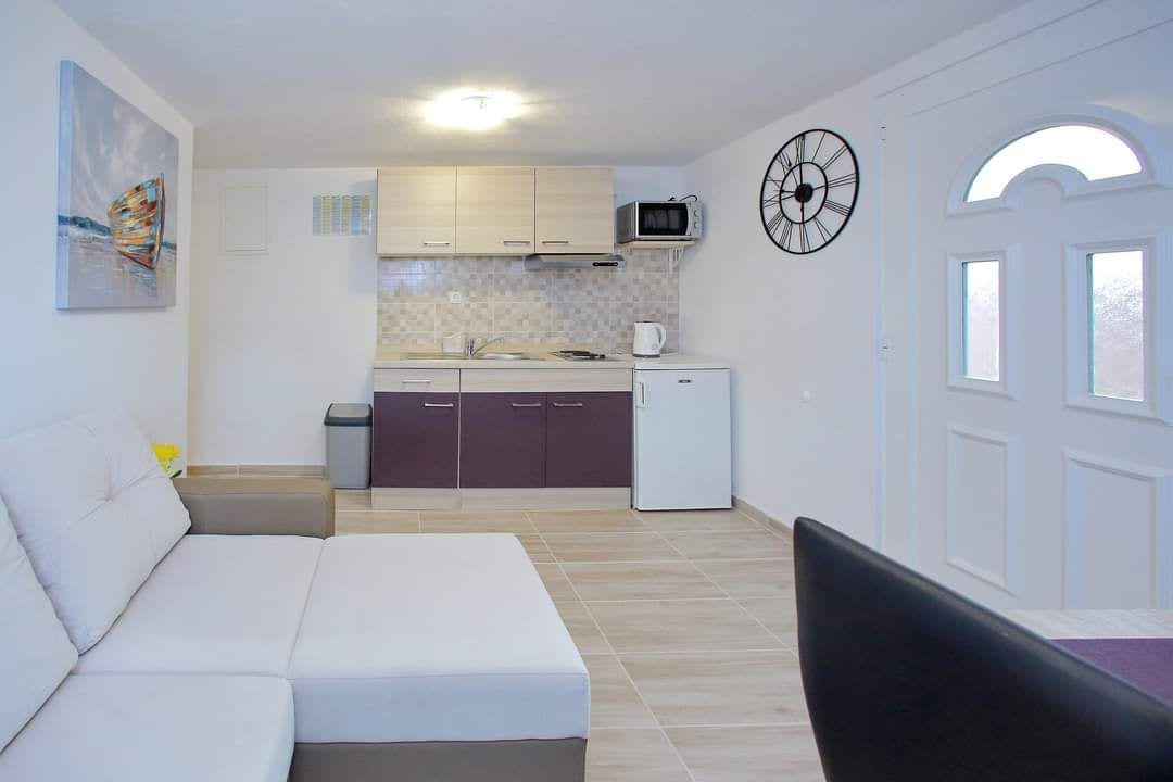 Opustite se u dvosobnom apartmanu sa 2 bračna kreveta plus pomoćni ležaj,kao i mogućnost korištenja putnog kreveta za bebu. Apartman se nalazi u mirnoj ulici bez puno prometa,okružen maslinama i borovom šumom. Nalazi se u obiteljskoj kući,ima svoj besplatan parking,tv,perilicu,klimu,wifi, veliko dvorište na kojem se ujedno nalazi i prostor za sjedenje,druženje kao i razne igre za djecu,također ima i mogućnost korištenja roštilja. Do plaže ima 5 min hoda,kao i do centra i restorana. Dobrodošli