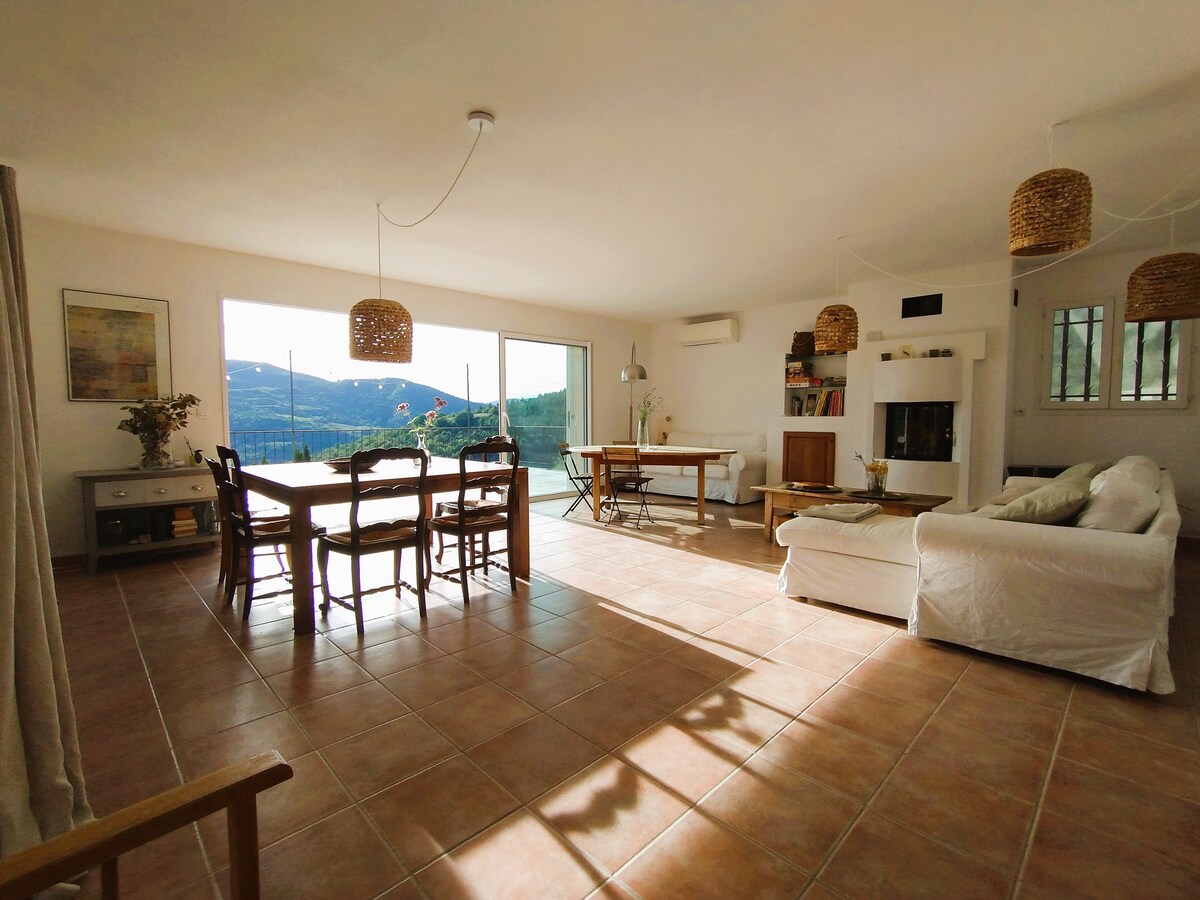 Havre de Paix et de de Nature...avec Vue exceptionnelle . La propriété en pleine Nature sur un terrain de 8 000 m² avec Prairie , un Champs d 'Oliviers , une Piscine (8 x 4 m) , deux grandes Terrasses...dans un paradis de diversité. La Maison est lumineuse et entièrement équipée NB : Sur les photos "via un drone", la piscine circulaire a depuis été remplacé par une piscine DESJOYAUX de 8m x 4 m et une grande terrasse de 36 m² donnant sur le jardin NB: Fêtes bruyantes strictement interdites!