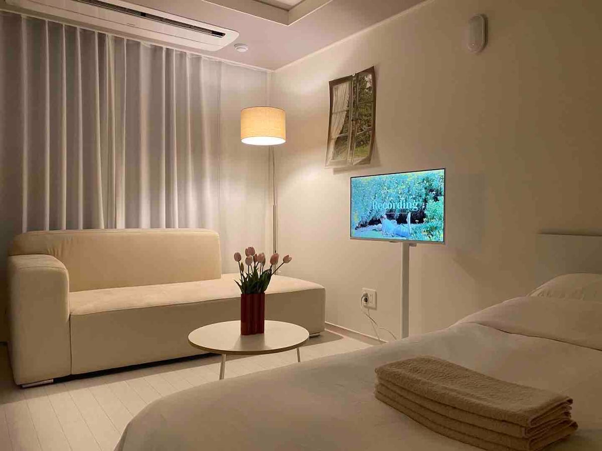 🍀숙소설명을 필독 해주세요🍀 호스트가 직접 관리하는 숙소입니다🩵 매일 방역 및 청결하게 유지하고 있습니다. ✔️체크인 4pm ✔️체크아웃 11am (리뷰이벤트 참여시 호스트와 상의) 📌숙소 옵션 -삼성 스마트 TV -삼성 시스템 에어컨 -초고속 wifi 지원 -삼성 스타일러 -드럼 세탁기 -전자레인지 📌주방 옵션 -인덕션 2구 -머그잔/와인잔 -s접시/m접시 -냄비1개 -조리도구(집게,국자,가위,칼) -수저셋트 📌저희 숙소는 간단한 조리(라면)만 가능합니다‼️ 참고해주세요!!😉🙏 ❌삼겹살,스테이크, 국, 찌개류, 파스타❌ 📌화장실 옵션 -핸드위시 -폼클랜징,클랜징오일 -샴프/컨디셔너/바디워시 -바디로션 -화장솜/면봉 -헤어드라이기 고데기 저희 숙소는 공중 위생관리법(제2조 1항 제2호) 기준을 준수하며 정식"숙박허가"를 받은 숙소입니다.