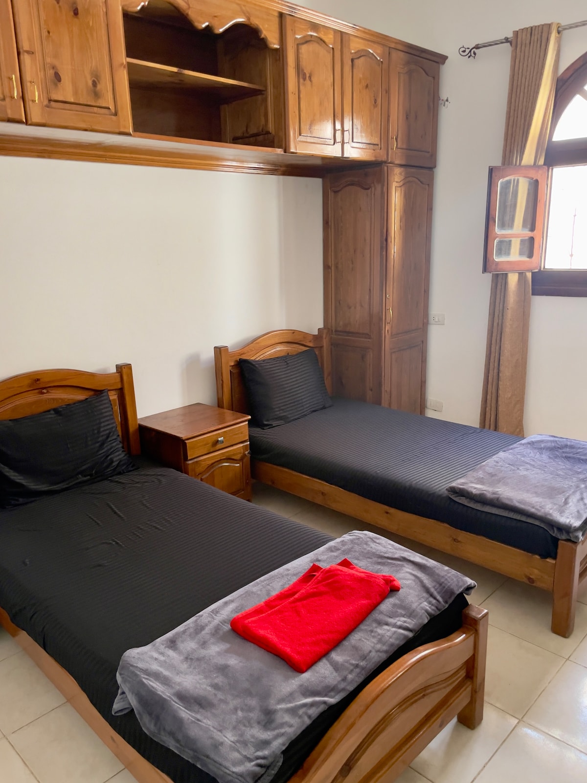Bright and comfy rooftop studio in a peaceful road in the heart of Dahab, just under 5 minutes’ walk to the beach and the Lighthouse area. The studio features two beds, air conditioning, a fully equipped kitchen, and a washing machine for your convenience. Guests can enjoy access to a private rooftop terrace, perfect for relaxing, dining, or enjoying the mountain and sea breeze. The location is quiet yet central, with cafés, restaurants, shops, and dive centers all within easy walking distance.