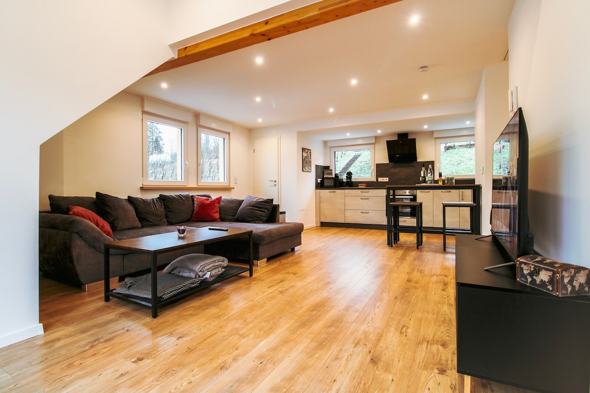 The wooden house is suitable for families and friends with up to 10 adults. The accommodation is located between the "Maare" (volcanic lakes) in the Volcanic Eifel near the Nürburgring and offers: Sauna for 5 people, 2 winter gardens, one with a pop-up pool, outdoor wood heated hot tub, fire pit, play area, trampoline, fitness equipment in the house, table soccer, table tennis in the large double garage, Netflix, wallbox for electric cars. 2 baby travel cots and 2 high chairs are available.