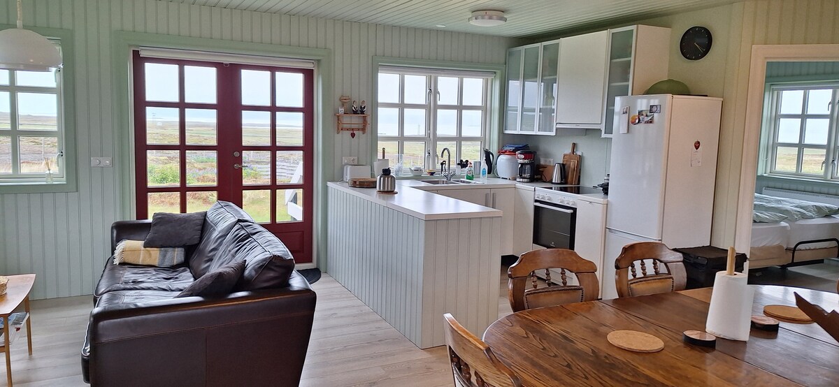 La cabaña está diseñada en el antiguo estilo rural islandés, pero con calefacción, agua caliente, cocina moderna bien equipada, lavavajillas y estufa de leña. La planta baja es de 35 (metros cuadrados). Arriba hay un ático de 20 metros cuadrados para dormir con una cama tamaño queen.