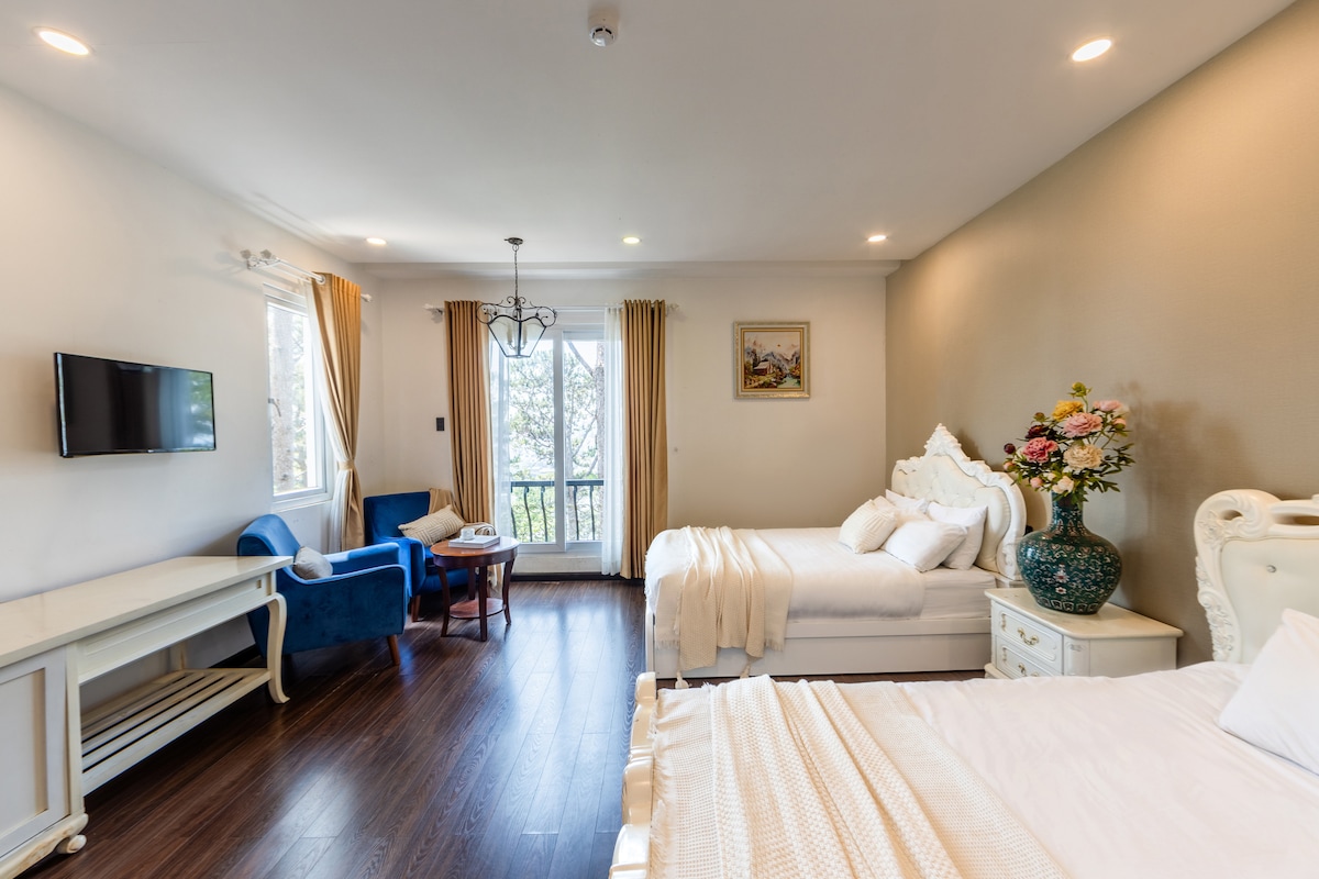 ✻ A double room with balcony (28m2) features 1 queen bed (1.6m) with private toilet ✻ Located in the heart of the city ✻ 1.6km to city center and plenty of famous landmarks, food and drink nearby ✻ Fully equipped hair dryer, iron (on request) ✻ Smart TV 32 inch. Fast wifi internet. Laptop friendly work space ✻ Free car parking on premise. ✻ 24/7 front desk support. Motorbike & car for rent, airport shuttle