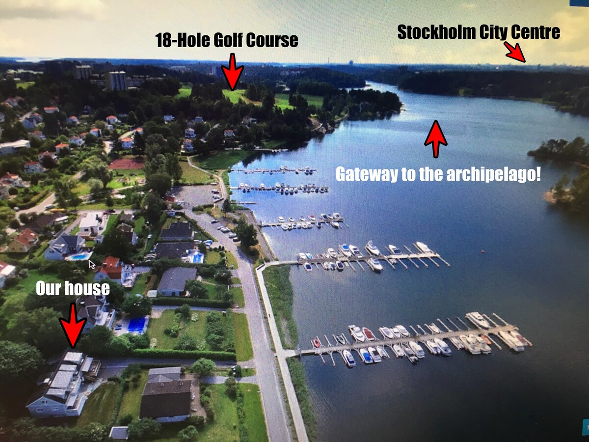 Este alojamiento para familias se encuentra en una zona tranquila con proximidad a varios campos de natación, campos de golf, bosque y mar, así como buena comunicación con Estocolmo.(15 minutos) Alojamiento: cuatro dormitorios con espacio para 6-8 personas, estudio y wifi disponible. Tres baños de los cuales uno con jacuzzi y sauna. Exterior: en la gran terraza hay muebles de salón, comedor en pérgola acristalada, cocina al aire libre con barbacoas y jacuzzi. En el jardín hay piscina, tumbonas, muebles de salón y trampolín. Hay bicicletas disponibles para pedir prestadas.