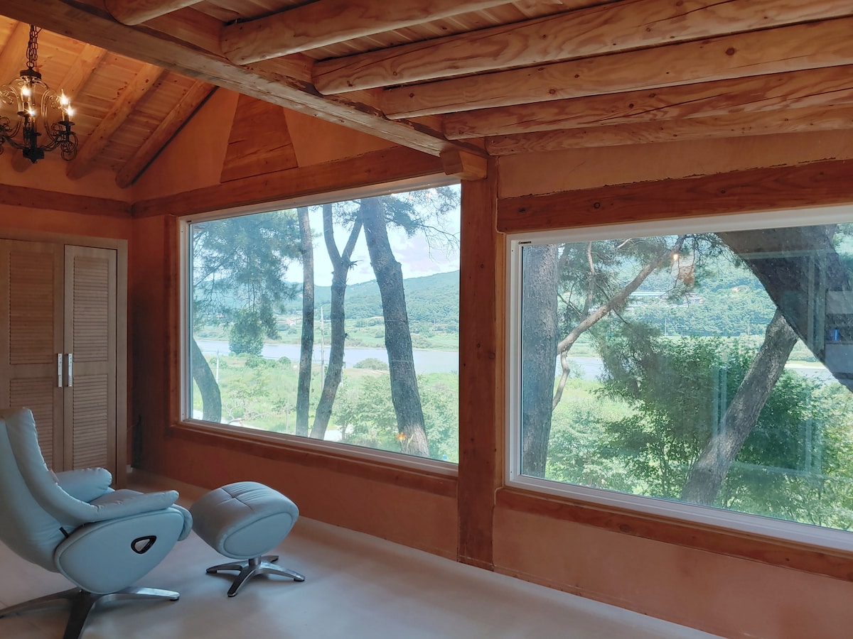 Es una casa de madera de 34 pyeong construida por la famosa compañía Rojas de una casa de campo rural, y el aislamiento es bueno y el aire en el alojamiento será agradable. Usando la ventana del sistema alemán (Eun Chang-ho), la habitación es fresca en verano, es cálida en invierno y el valle acuático de primera clase justo enfrente del alojamiento (400 pyeong) (además de la profundidad de los pechos adultos), parque acuático para niños pequeños, etc. Será un espacio donde realmente podrás relajarte y recargar tu energía lejos de la ciudad con flores y árboles de temporada bien mantenidos. * Hacer una hoguera con leña de roble, * Una copa de vino y Barbacoa de carbón (Hoengseongwoo, mariscos, etc.) * El sonido del agua curativa ASMR, * Jardín florido, * Paisajes nevados, * Observación de las estrellas por la noche * Terraza llena de sol que canta el sonido de los pájaros... * Sauna finlandesa * Nuestro alojamiento tiene muchos huéspedes que lo visitan según la temporada. Hay algunas cosas que no se pueden capturar en las fotos, así que ven a disfrutarlas y sanar. ^ ^