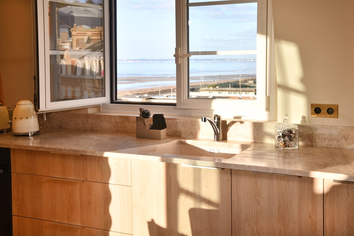 Amplio 3 habitaciones de 65 m2 + gran terraza con vistas panorámicas al mar, Trouville y Deauville. Situado en una residencia segura a 8 minutos a pie del centro de Trouville y de la playa. - Entrada - Sala de estar, comedor con salida a la terraza - Terraza orientada al oeste (sol por la tarde hasta la puesta de sol que se puede contemplar desde la terraza) - Cocina abierta a la sala de estar, amueblada y equipada - 2 dormitorios con camas de 160 cm. Vestidor - Gran cuarto de ducha - Aseos separados