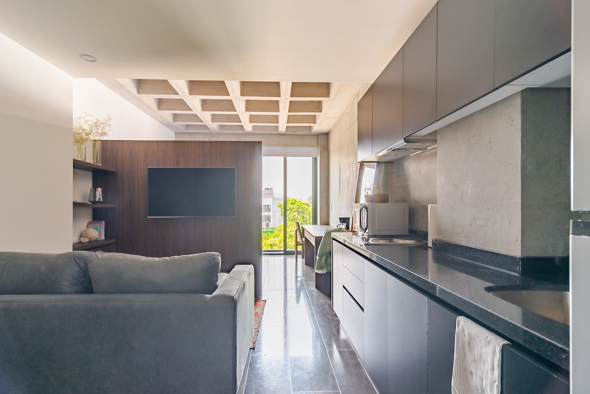 Departamento con dos espacios principales. En uno tienes una cocina amplia con comedor, y en el otro espacio tienes una recamara con cama tamaño king, televisión, wifi y baño. El departamento esta ubicado en el corazón de la roma Condesa enfrente de la plaza luis cabrera arriba del café toscano donde podrás disfrutar de un gran desayuno todos los días.