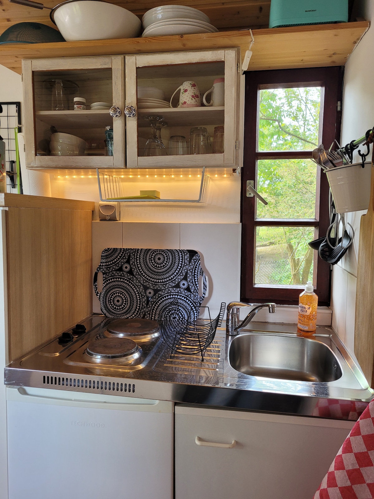 Gemütlicher Bauwagen im Garten, mit Duschbad