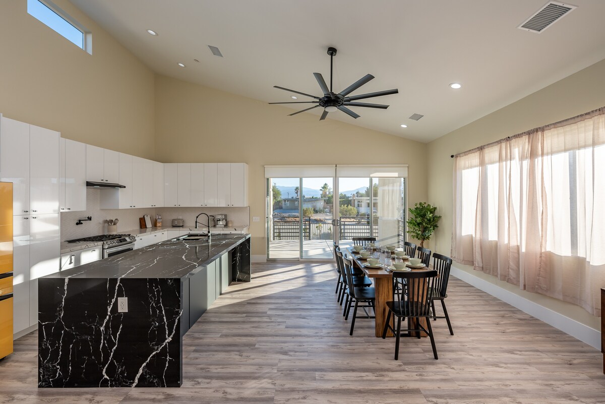 Disfruta de una escapada familiar en el desierto en un oasis moderno. Disfruta del sol junto a la piscina privada de agua salada, sumérgete en la bañera de hidromasaje con impresionantes vistas a la montaña o desafía a tus amigos a un partido de minigolf. Relájate viendo las pintorescas puestas de sol alrededor del fogón. Relájate en el amplio salón con un acogedor rincón de lectura, perfecto para acurrucarse con un libro y disfrutar de una película. ¡Tu escapada de ensueño al Valle de Coachella te espera!