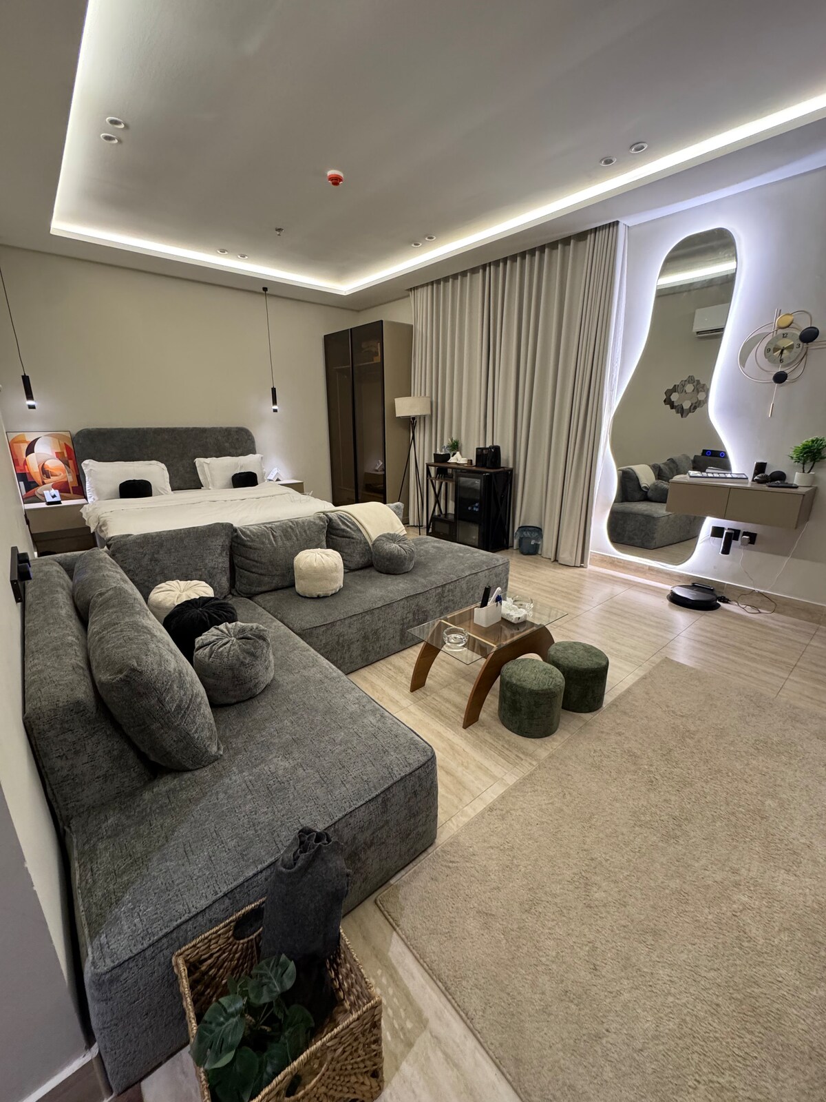 ستديو كبير بتصميم أنيق ولمسات فخمة يحتوي على سرير مريح، تلفزيون ذكي، إنترنت سريع، وجاكوزي خاص دورة مياه بتشطيب فندقي، الموقع في حي العليا الخبر، قريب من الكافيهات والمطاعم والخدمات الدخول ذاتي لتجربة هادئة ومريحة.