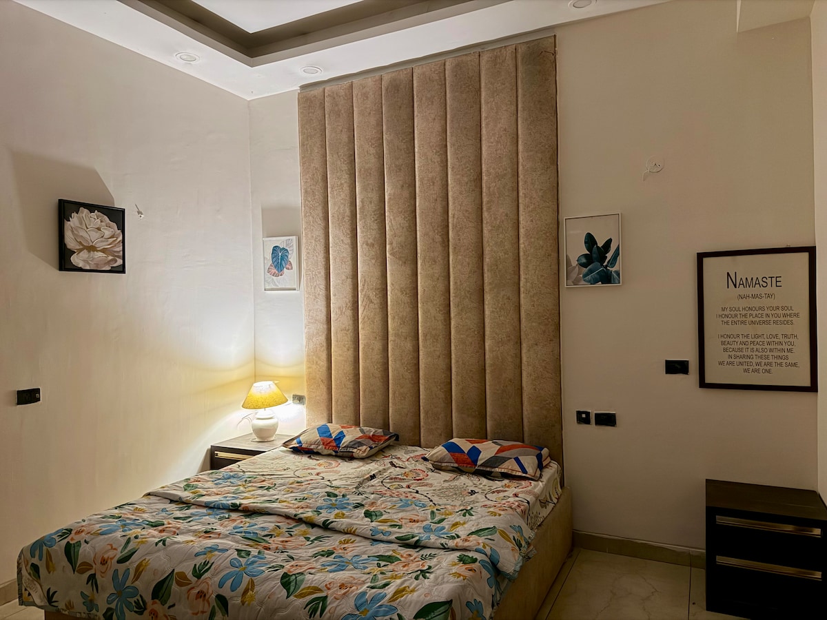 Welcome to PEBBLESTAY. A spacious 3-bedroom apartment which is perfect for families & friends, out of which 2 of them open out to private balconies with 2 bathrooms. A unique living room with a stunning flower-covered accent wall that adds a touch of nature to the space. Whether you’re relaxing indoors or snapping a few photos, this unique wall is a guest favorite. There’s a dedicated workspace with high-speed Wi-Fi, ideal for remote work. 25-30 mins drive to Expo Centre Noida.