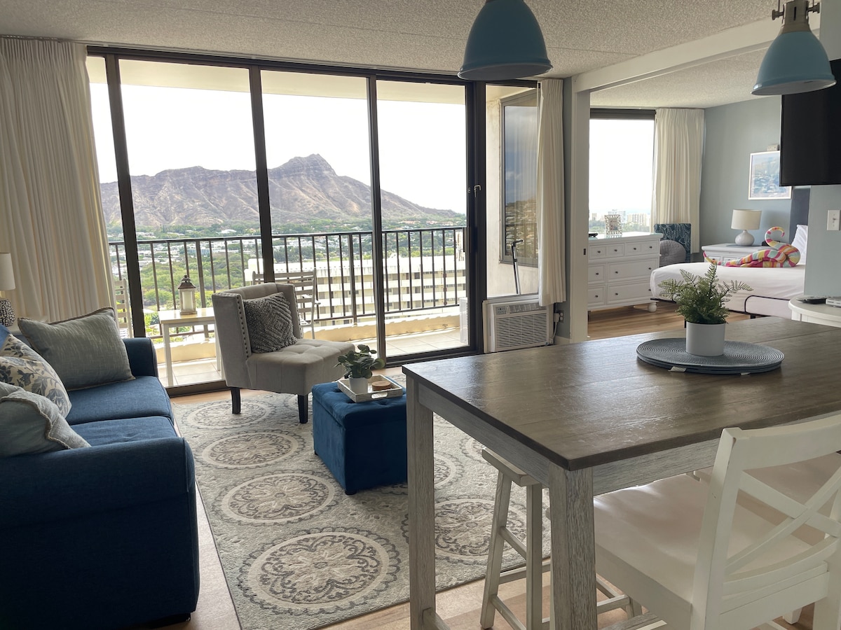 Ubicado a pocos pasos de la mundialmente famosa playa de Waikiki, este apartamento recién renovado ofrece amplias vistas panorámicas de Diamond Head. ¡Disfruta del café por la mañana en la cama o de los cócteles por la noche en el lanai con algunas de las vistas más impresionantes que Waikiki tiene para ofrecer! El Waikiki Banyan es una de las direcciones más buscadas de Honolulu y ofrece un lado más tranquilo de Waikiki, a poca distancia a pie de la playa, el parque Kapiolani y la avenida Kalakaua. ¡Plaza de aparcamiento gratuita incluida!