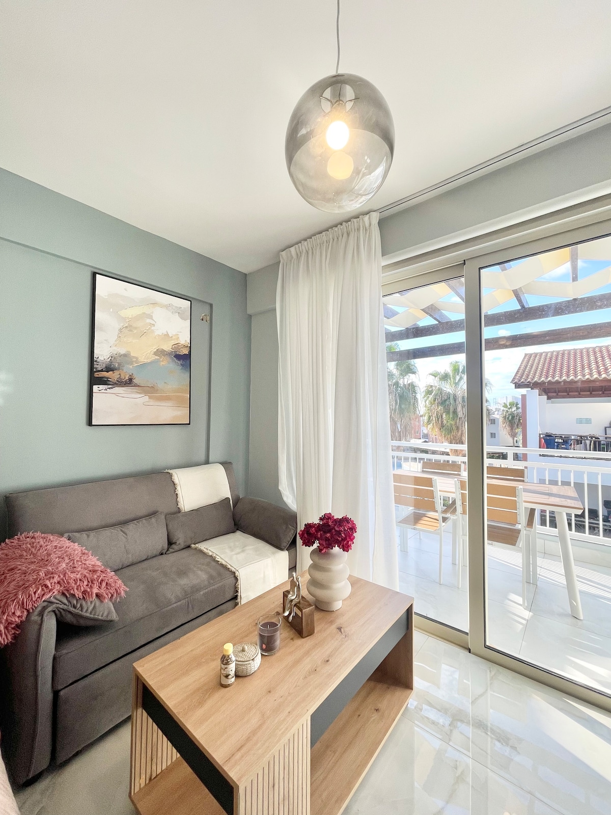 Fantastic apartment with beautiful garden and pool views. + 50qm Living Space and 25qm terrace + Outdoor Pool + Parking free of charge + Wi-Fi 500 mbits Download 250 mbits Up + Working extendable table 120-160cm + SMART TV + Soundbar + PS5 + Sunbeds free of charge + SODAP BEACH 1,6km + Farm Supermarket 0,1km + Bus station 0,1km + Pumbis Diner Restaurant 0,2km + Harbor Port 1,8km + Party & Baar Street 0,9km + Airport 15km + Full equipmented kitchen + Capsules Coffee mashine + Lift in house