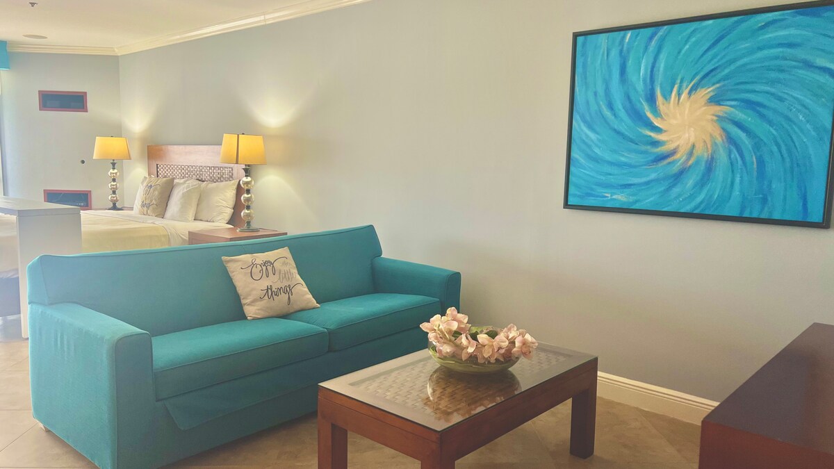 This beautiful studio reflects Aruba's blue colours with a very Modern and CLEAN design, offering a very comfortable KING size bed & King size pillows, a fully functional kitchen, beautiful walk-in closet, modern bathroom with a spa like Rainfall shower. Located on the highest floor of the building with a stunning view of downtown Aruba as well as the harbour! Enjoy the infinity pool and rooftop hot tubs with 360 view and state of the art gym overlooking the water and cruise ships!