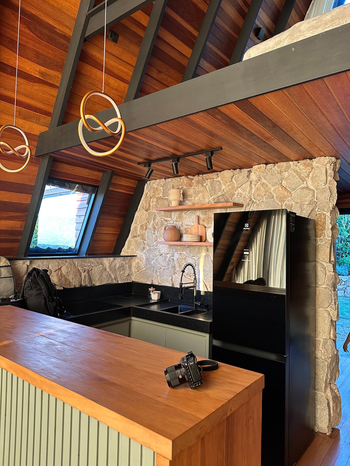 Disfruta del jacuzzi con cromoterapia y vistas a la naturaleza a través de la pared de vidrio que crea una experiencia única. La cocina compacta pero completa ofrece todo lo que necesitas: estufa, minibar, filtro de agua (fría y helada), cafetera de cápsulas, freidora de aire y máquina de fondue. Para tu comodidad, toda la cabina tiene calefacción de gas en los grifos, ducha y bañera, así como aire acondicionado, Wi-Fi, TV inteligente y una acogedora chimenea para noches perfectas.
