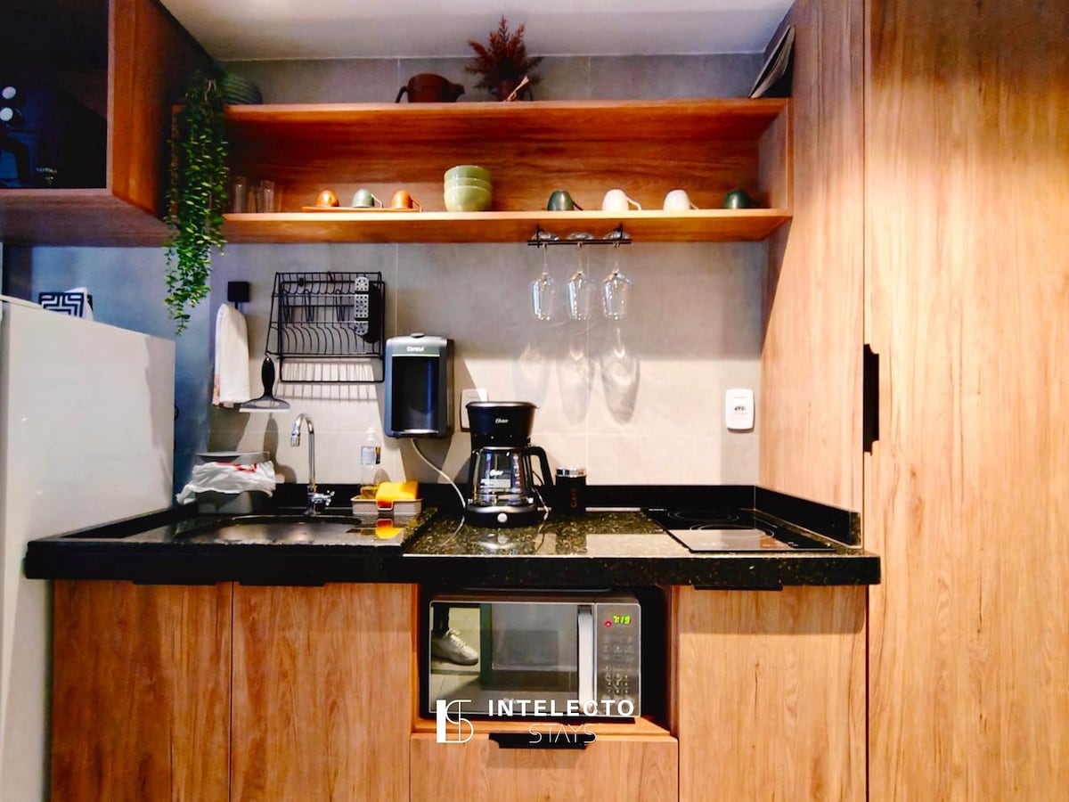 Dúplex de 1 dormitorio, zona exterior con jacuzzi, barbacoa, oficina doble y todas las comodidades para disfrutar de tu estancia. El edificio tiene ascensor, pero el apartamento tiene una escalera interna para acceder a la zona superior, esta escalera tiene una inclinación más alta de lo normal, por lo que no es apto para personas con problemas de movilidad (ver foto de la escalera) - Frier de aire. - Refrigerador y minibar. - 2 Televisões - Horno - Barbacoa. - Lavadora.