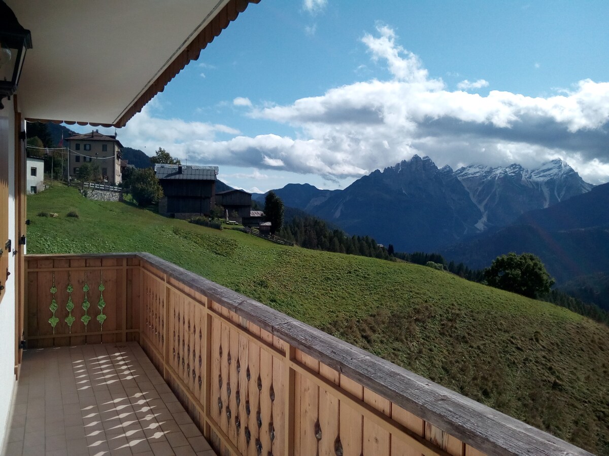 Grande appartamento al secondo piano di villa a 1500 m.di altitudine con vista spettacolare sulle dolomiti, adatto a gruppi numerosi , fino a 11 persone.Per gruppi fino a 7 persone offro 2 stanze con servizi biancheria inclusa ,cucina con zona pranzo completa di stoviglie,bagno con doccia ,balcone panoramico ,lavanderia, posto auto e wifi. La casa si trova sulla strada che porta al rifugio Venezia sotto il monte Pelmo in vetta a 3168m, nelle giornate limpide si vede la laguna di Venezia.