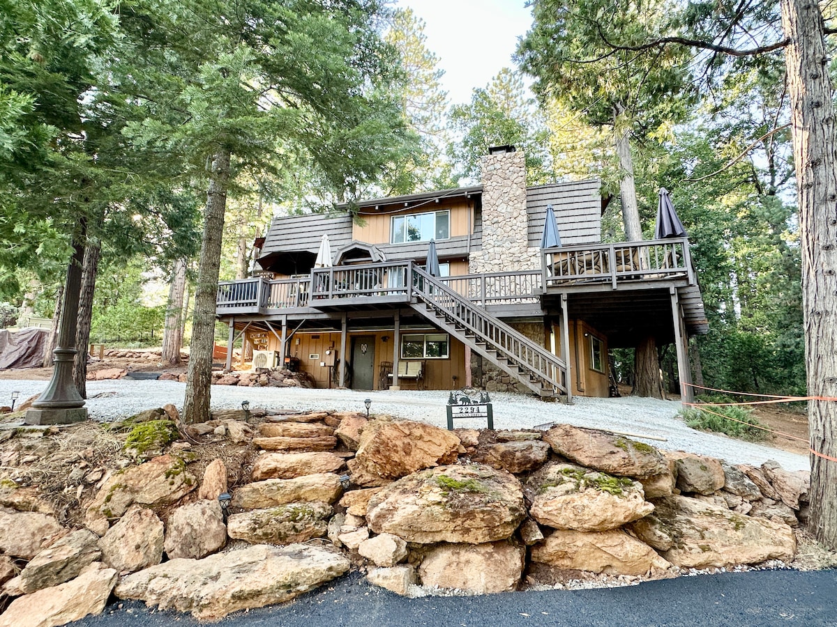 * INCREÍBLES VISTAS desde este lujoso y GRANDE chalet de 3 pisos en BLUE LAKE SPRINGS * CAMINA 1/2 milla hasta la piscina privada de Blue Lake Springs, lago, tenis, pickle ball, playa, restaurante y más * JACUZZI privado con vistas * Gran SALA DE RECREACIÓN con mesa de billar, ping pong, air hockey, dardos, 3 salas de juegos, chimenea de gas, TV, futbolín * Generador de toda la casa, lo que significa que no habrá más cortes de energía * Aire acondicionado * ENORMES televisores de 70 pulgadas * A 30 minutos de Bear Valley Skiing, a 10 minutos de Big Trees * ¡Se admiten perros! *RESERVA 3 NOCHES Y OBTÉN LA 4.ª GRATIS EN OCTUBRE. ¡ENVÍAME UN MENSAJE PARA CONSEGUIR LA OFERTA!