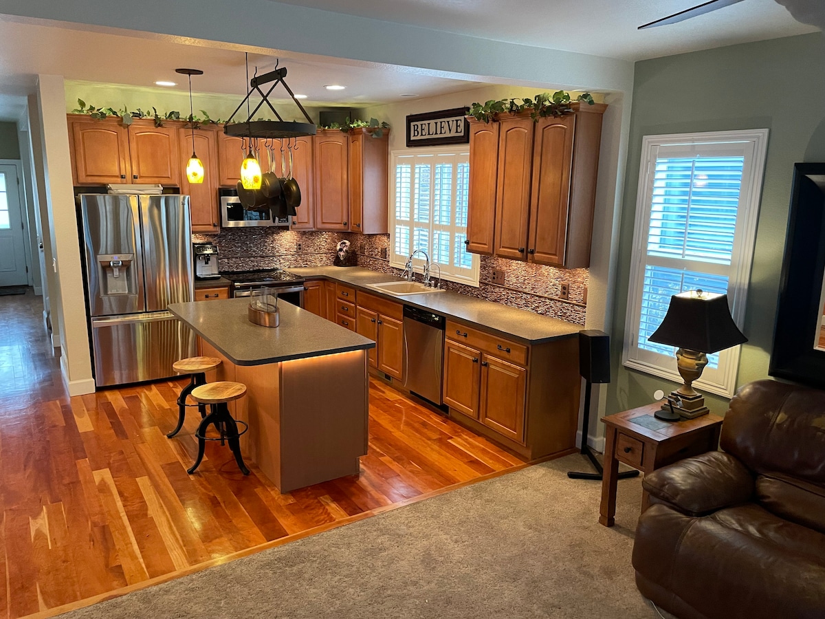 Enjoy stunning Pikes Peak views from this 4BR/2BA home on a half-acre lot in Colorado Springs—perfect for families and groups. The updated kitchen features mountain views, making meals feel special, while the cozy living room with a large-screen TV is ideal for relaxing after exploring Garden of the Gods or the Air Force Academy. A dedicated workspace makes remote stays easy. Enjoy a large backyard with a cozy seating area. Kids will love the custom playhouse, giving everyone space to unwind.