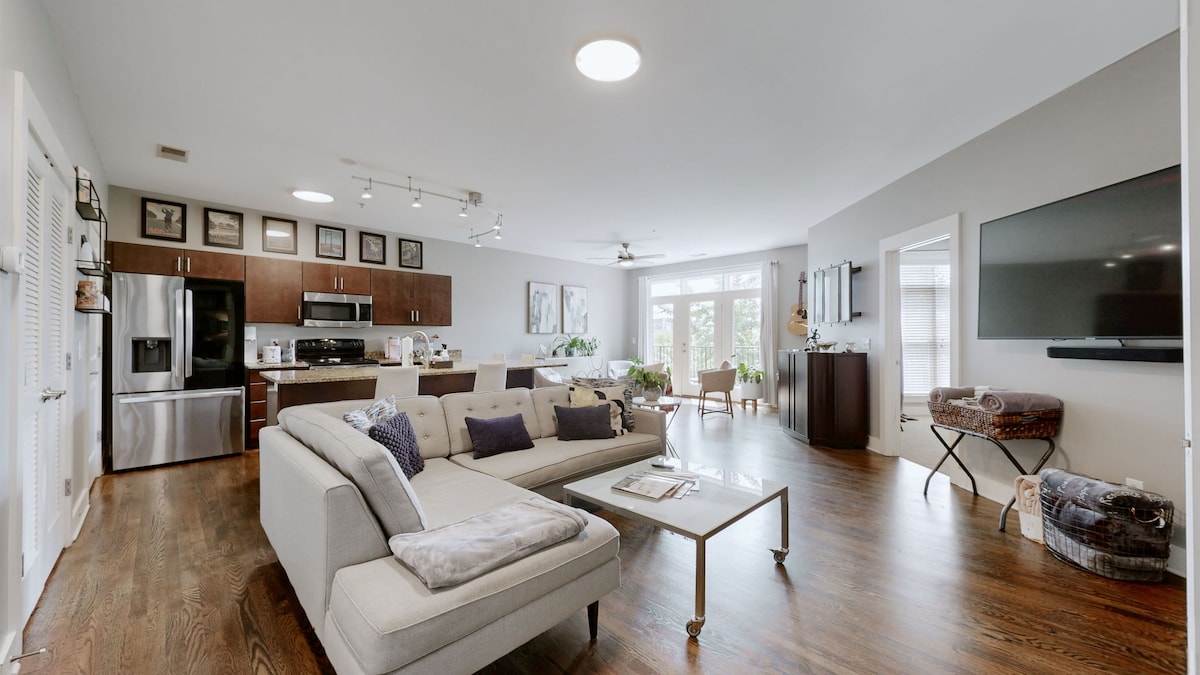 Alójate en un departamento luminoso y de diseño único en el corazón de The Nations, uno de los barrios más transitables de Nashville. Camina hasta más de 20 restaurantes y bares y 5 cervecerías, luego relájate en un amplio espacio abierto o en tu terraza privada en la azotea. Disfruta de estacionamiento gratuito, café gratis, wifi rápido, una cocina completamente surtida y comodidades en todo momento. A solo 9–12 minutos de Broadway, lugares del centro, estadios y a 15 minutos del aeropuerto, ¡perfecto para trabajar o jugar!