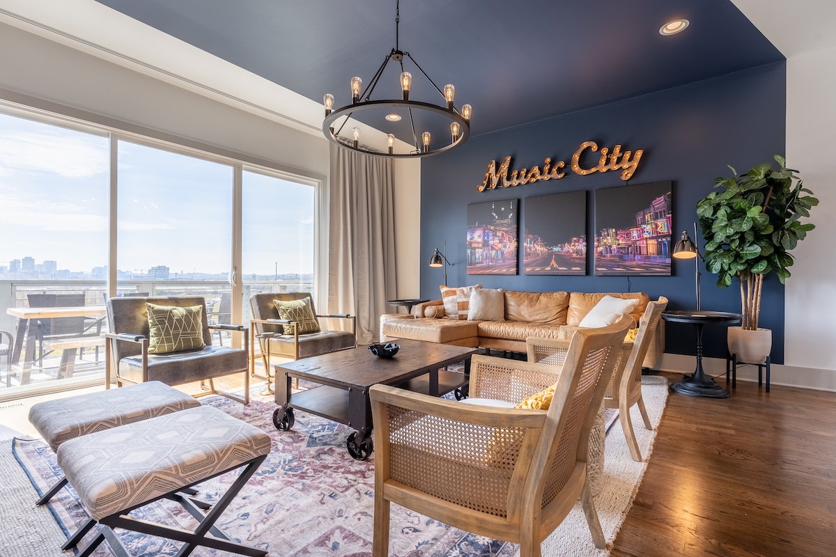 ¡Tendrás todo el apartamento de 2 pisos para ti! Ubicada en SoBro, la unidad cuenta con una cocina totalmente equipada, sala de estar con sofás cama, comedor para 8 personas, 2 dormitorios y 2,5 baños. Esta unidad incluye una lujosa cama tamaño king en el dormitorio principal. El segundo dormitorio tiene una cama tamaño queen y una cama individual con una cama nido debajo. Cada dormitorio está conectado a un baño con ducha a ras de suelo, lavabo e inodoro. ¡Es todo lo que necesitas para que tu viaje a la Ciudad de la Música sea una experiencia maravillosa!