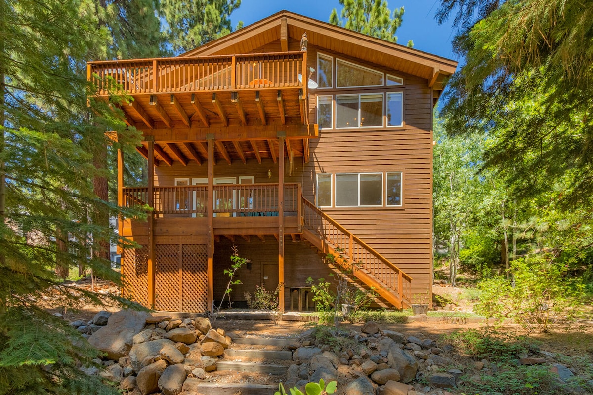 Casa de vacaciones de alta gama a estrenar, enclavada en el corazón del bosque entre Truckee y el lago Tahoe. Plano de planta abierto y espacioso con techos altos, interior diseñado profesionalmente, 2 amplias salas de estar, gran chimenea de gas de granito, cargador de Tesla, aire acondicionado, 3 balcones, literas, 2 baños privados, cocina totalmente equipada, TV HD de 70 pulgadas, suscripción a YouTubeTV y Disney+ incluida, barbacoa de gas Weber y mucho más. ¡A los niños les encanta la habitación con literas!