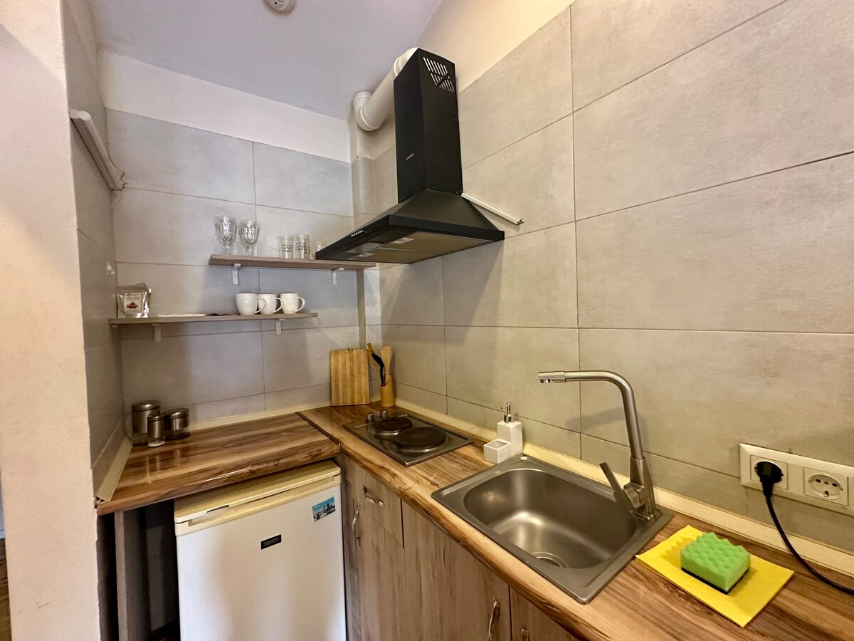 Se trata de un cómodo apartamento renovado con ladrillo visto y auténtico toque tiflisí. Este estudio tiene un baño transparente con bañera moderna, cama tamaño king, sofá Chesterfield, etc. El espacio tiene capacidad para 2 personas y se encuentra en una calle peatonal histórica. Internet wifi de alta velocidad e IPTV (canales internacionales) se proporciona de forma gratuita. El apartamento también está bien situado para el transporte: el metro Marjanishvili y las estaciones de autobús están a poca distancia a pie y te llevan a cualquier lugar de Tiflis en poco tiempo.